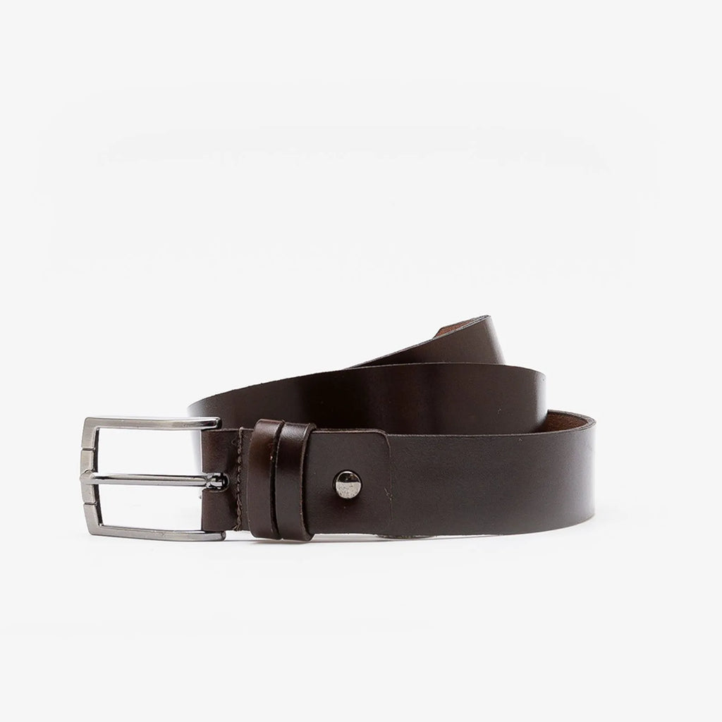 Cinto confeccionado em couro, na cor café. Passador duplo, fivela de metal e contém cinco furos para melhor ajuste.